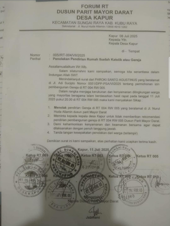 Frnkalbarnews.com – Pemerintah Kabupaten Kubu Raya mengambil langkah cepat menyikapi surat yang mengatasnamakan Forum RT Dusun Parit Mayor Darat, Desa Kapur, Kecamatan Sungai Raya, tertanggal 8 Juli 2025, yang berisi dugaan penolakan terhadap pendirian rumah ibadah di wilayah tersebut.