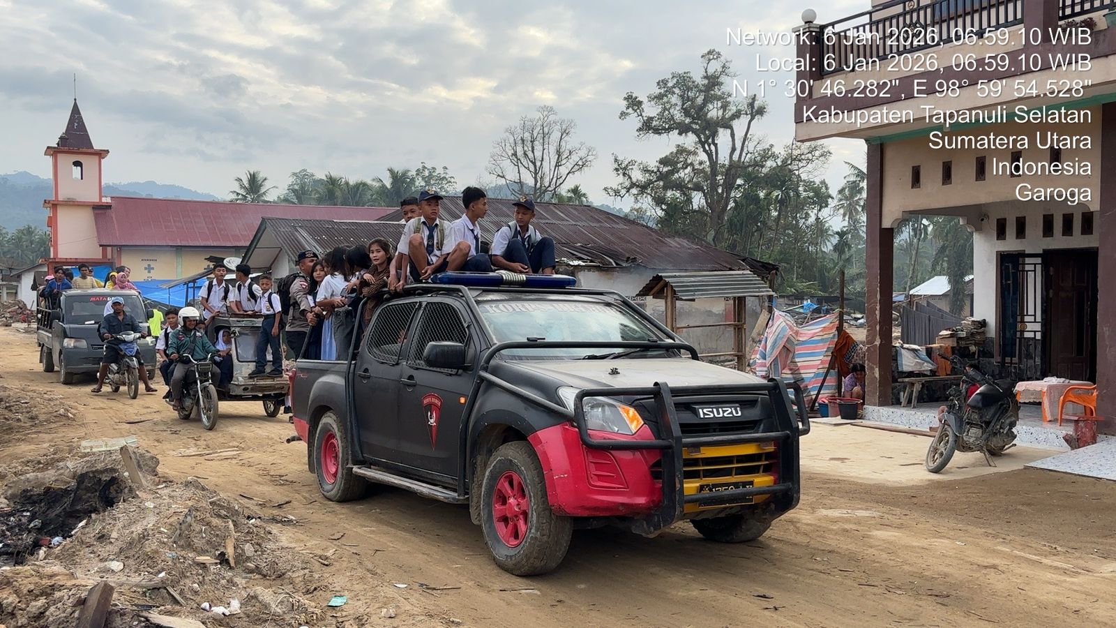 Kegiatan tersebut dilaksanakan pada Selasa, 6 Januari 2025, mulai pukul 06.30 WIB hingga selesai, berlokasi di Desa Garoga, Kecamatan Batang Toru, Kabupaten Tapanuli Selatan. Empat personel Posko Utama Garoga turun langsung membantu anak-anak sekolah yang mengalami kesulitan transportasi akibat rusaknya akses jalan serta tidak tersedianya angkutan umum pascabencana.