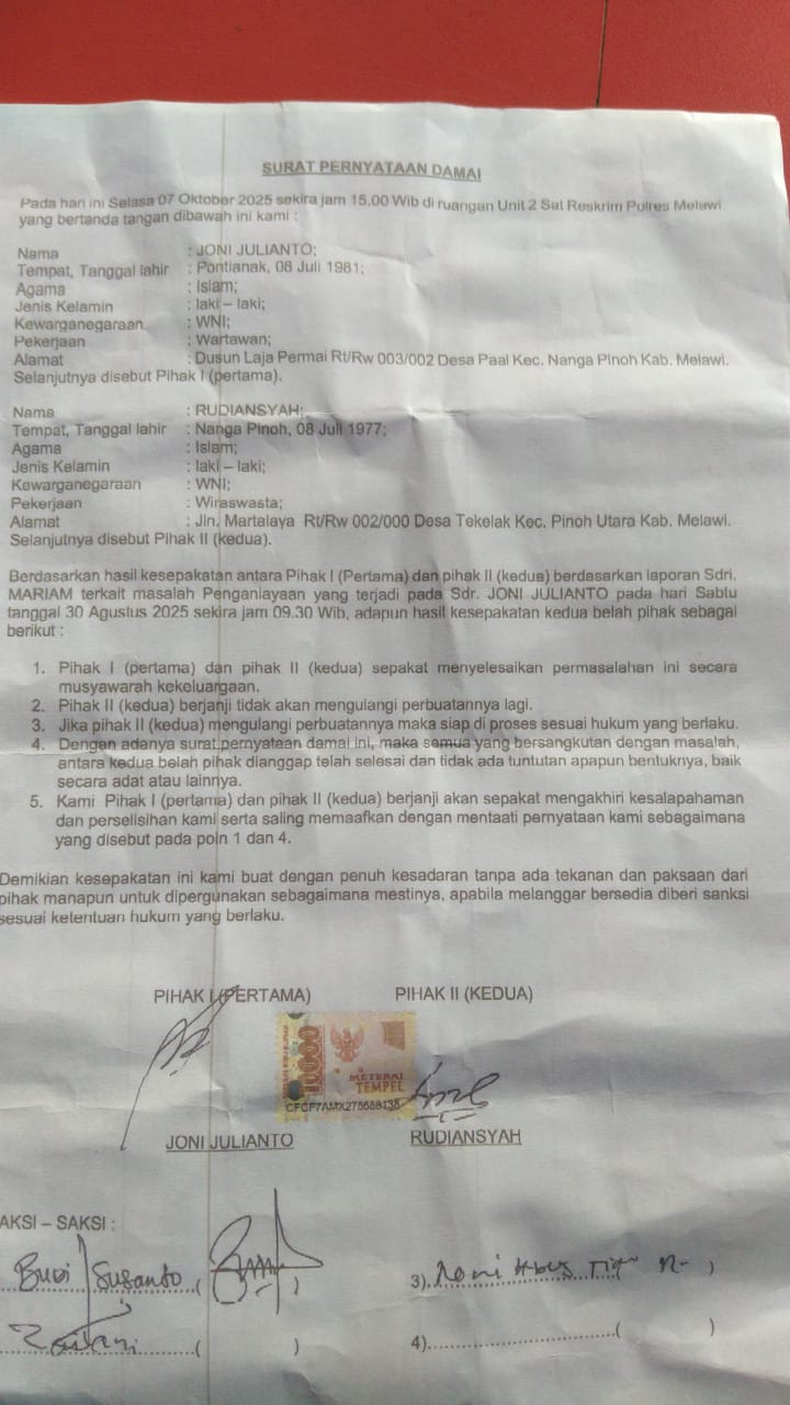 Saat di konfirmasi dengan adanya surat pernyataan kesepakatan berdamai antara kedua belah pihak korban dan Pelaku tersebut, Joni Julianto sebagai salah satu wartawan senior di Melawi membenarkan bahwa pada Selasa tanggal 7 Oktober 2025 kami telah sepakat berdamai dan selesai secara kekeluargaan.