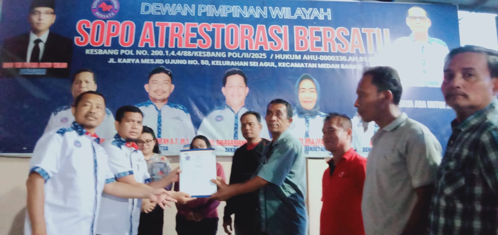 “Penyerahan SK mandat ini merupakan momentum penting dalam memperkuat struktur organisasi Sopo ATRestorasi Bersatu, dan kami berharap seluruh jajaran tetap solid dan terus berkontribusi nyata bagi masyarakat,” ujarnya kepada awak media yang bertugas.