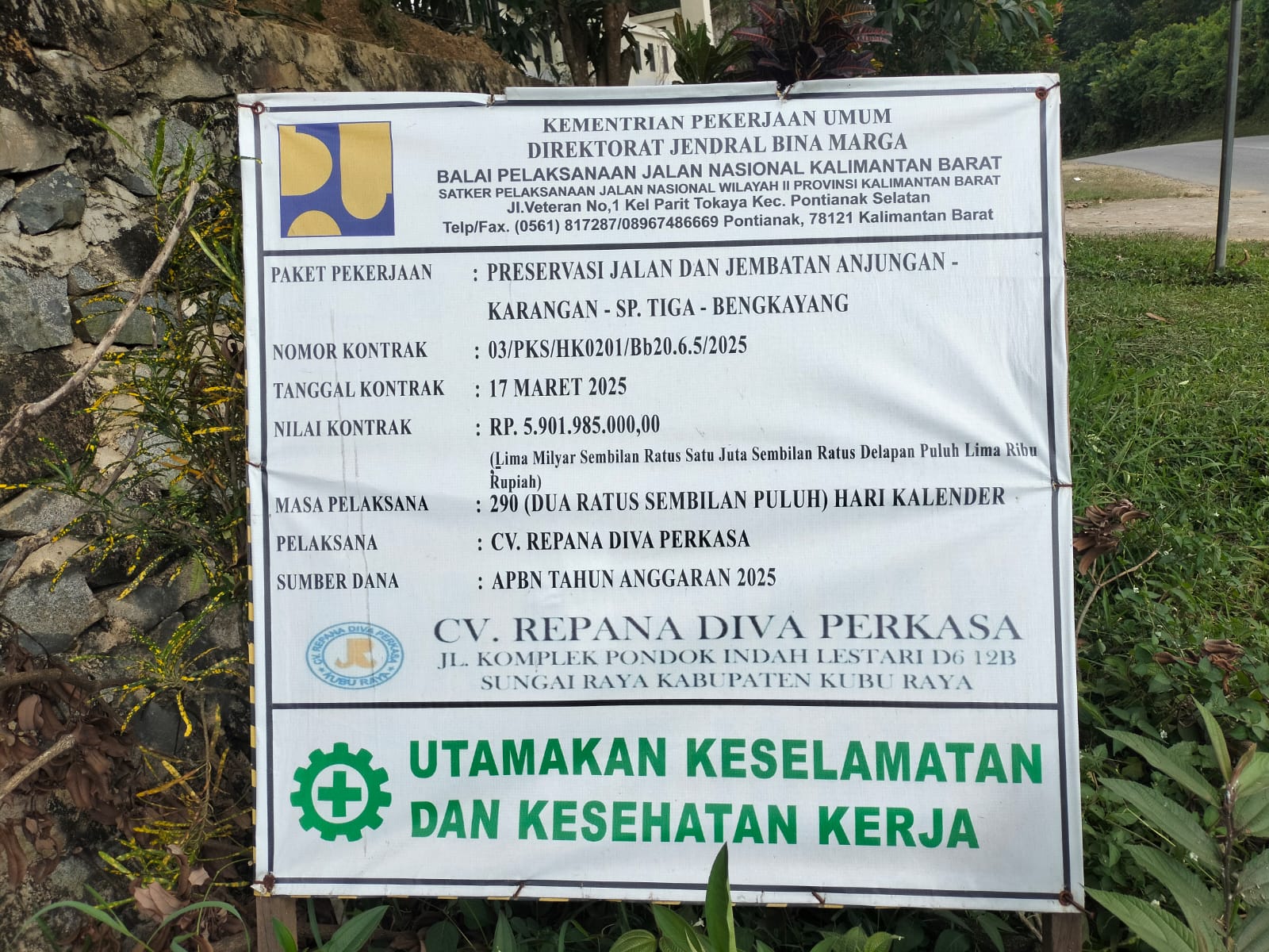 Perlu di ketahui bahwa proyek Preservasi jalan dan jembatan Anjungan Karangan Simpang tiga -Bengkayang di laksanakan oleh pihak CV Repana Diva Perkasa Dengan nilai kontrak RP 5.901.985.000.00 (Lima Miliar Sembilan Ratus Satu Juta Sembilan Ratus Delapan Puluh Ribu Rupiah) Yang Bersumber dari Dana APBN tahun 2025.Kementrian Pekerjaan Umum Direktorat Jendral Bina Marga.Melalui Balai Pelaksanaan Jalan Nasional Kalimantan Barat.