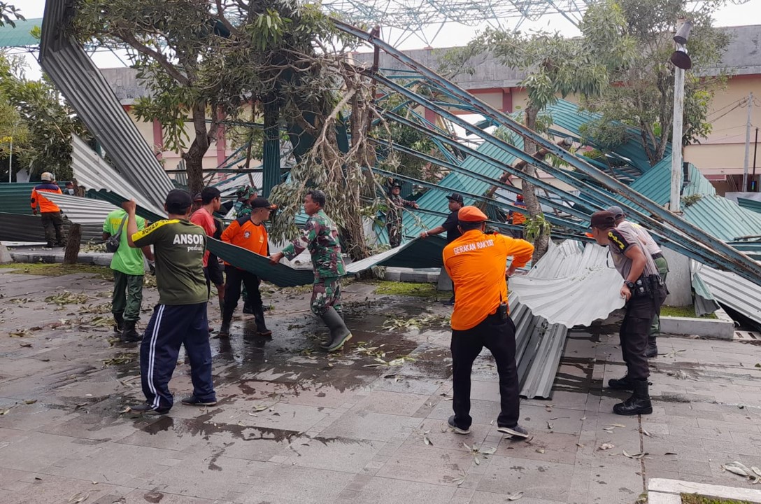 TNI – Polri Dan Warga Gelar Kerja Bakti Bersihkan Reruntuhan Atap Stadion Gelora Penataran Pasca Bencana